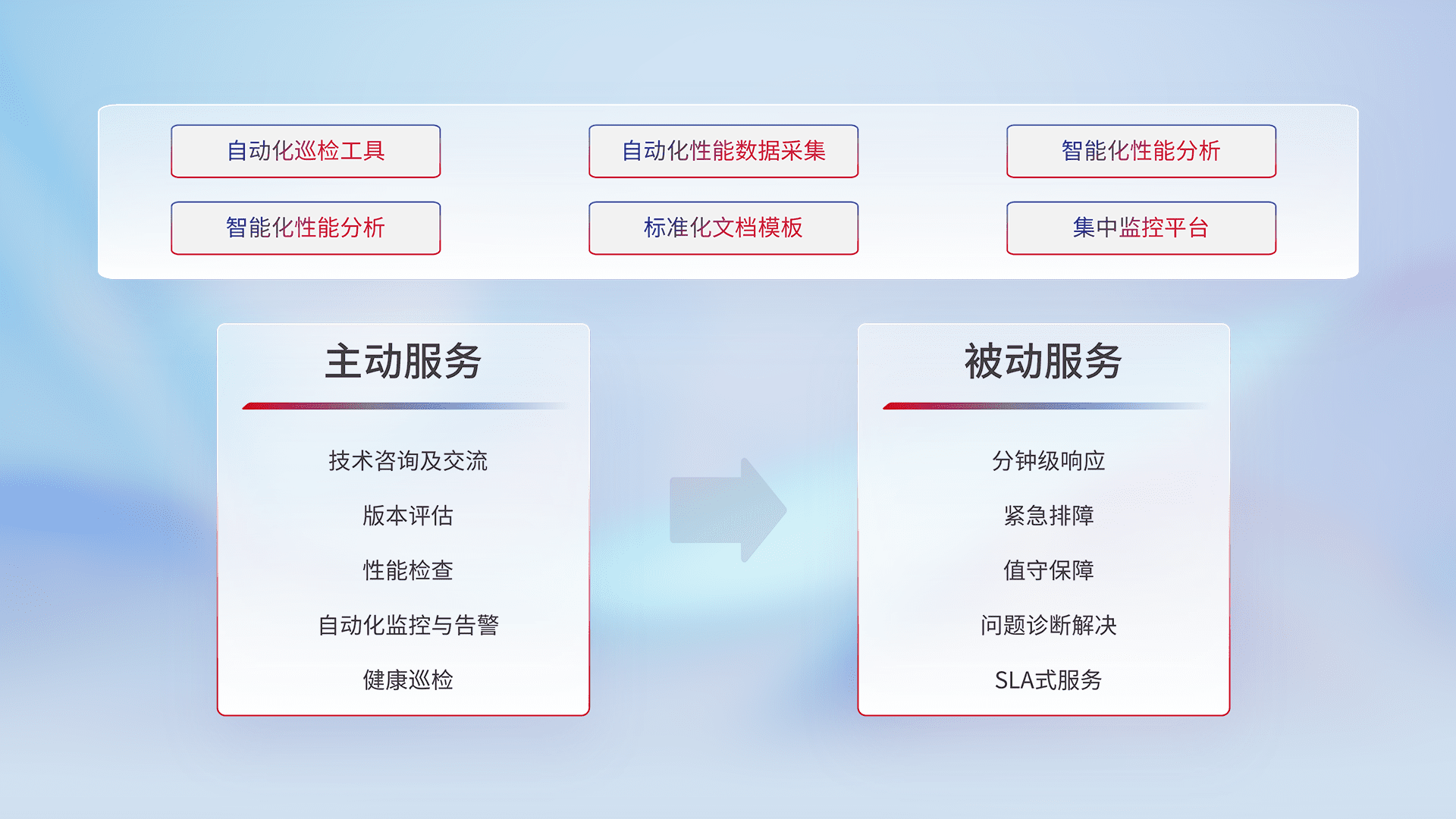 智能化工具和标准化文档,,,,保障服务质量,,,,提供主动服务(包含技术咨询、、、、版本评估、、性能检查、、、自动化监控与告警、、、、健康巡检)和被动服务包含(分钟级响应、、、、紧急排障、、值守保障、、问题诊断解决、、SLA服务)。。。。